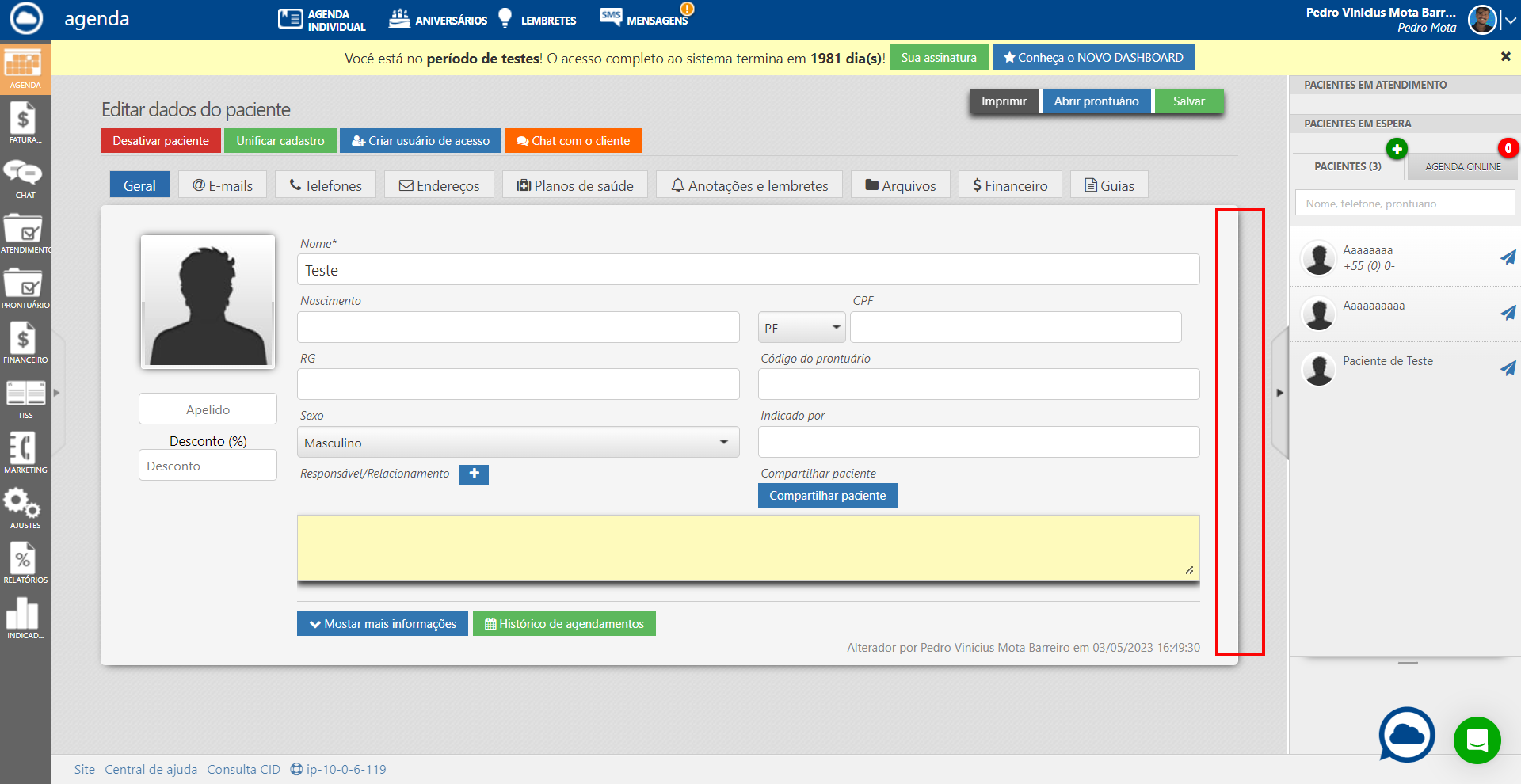Inicialmente, essa é a interface original da tela de cadastro e das informações do paciente.