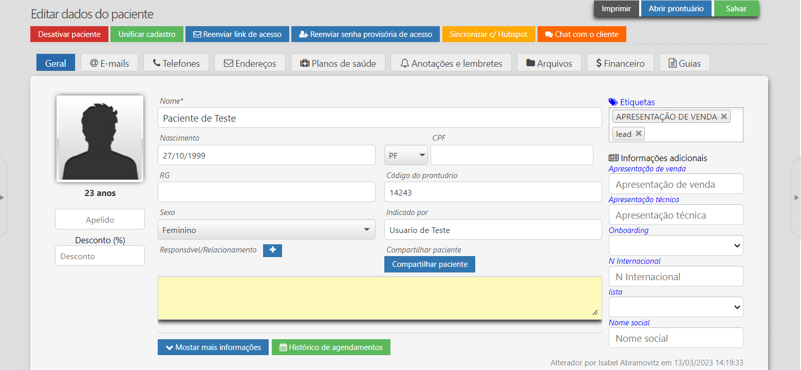 Após incluir, você já pode verificar no campo de cadastro do paciente a informação adicionada.