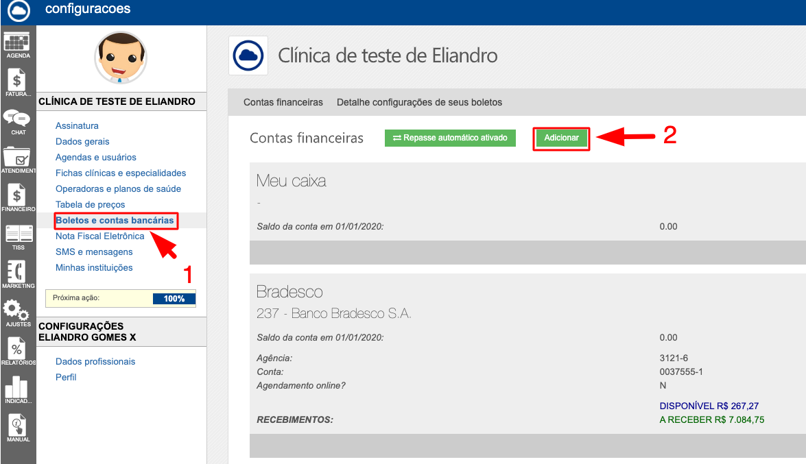 Acesse o menu boletos e contas bancárias e clique no botão adicionar: