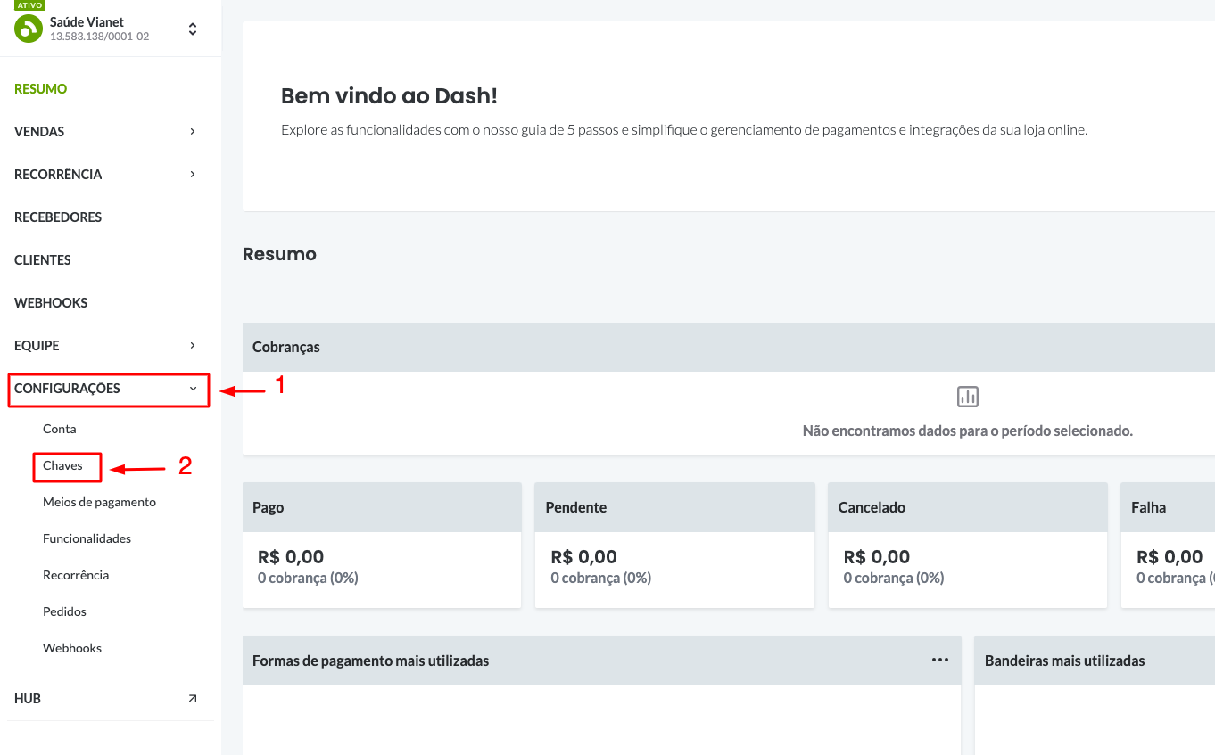 Após fazer login na plataforma do pagarme, siga os passos abaixo: