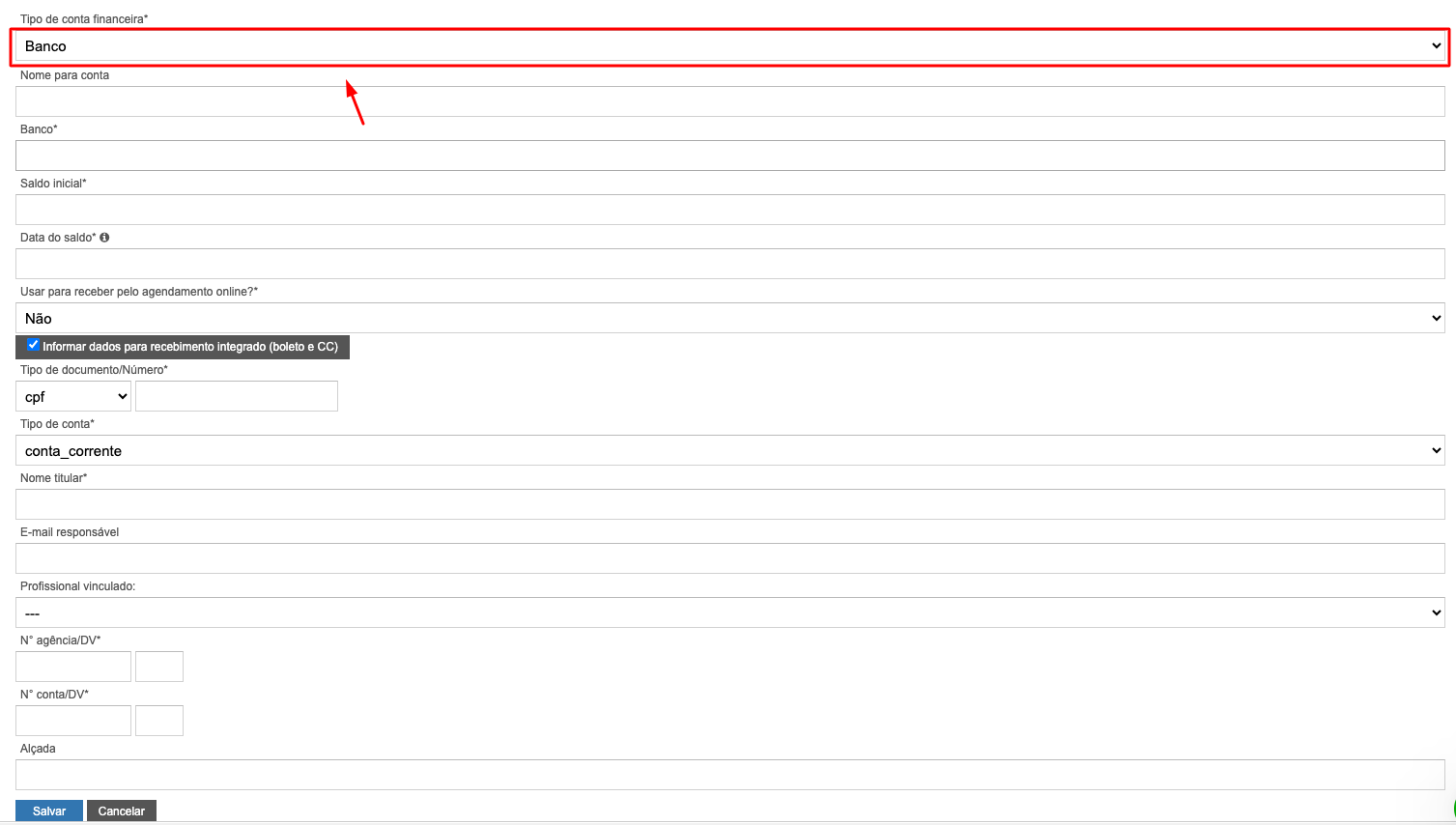 Sua conta financeira deve ser do tipo Banco, preencha todas as informações, depois clique para salvar.