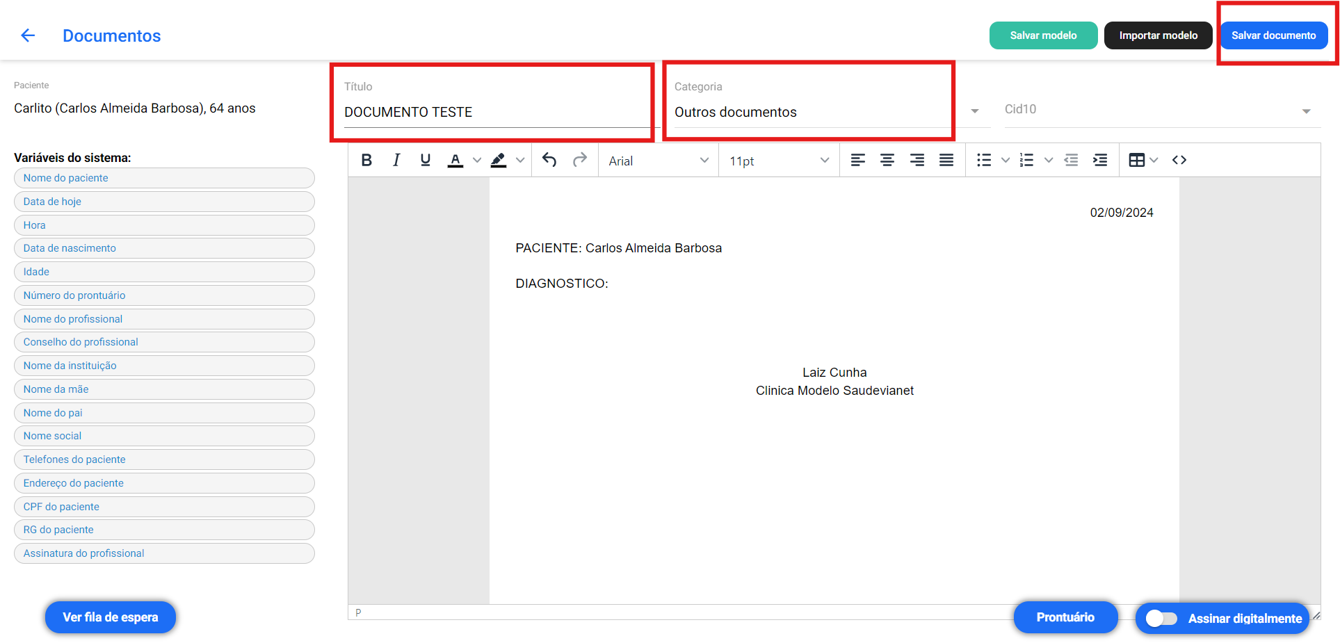 ⚠️ Se o documento estiver configurado como "somente leitura" para determinados usuários, esses profissionais poderão visualizar o documento, mas não poderão editá-lo.
