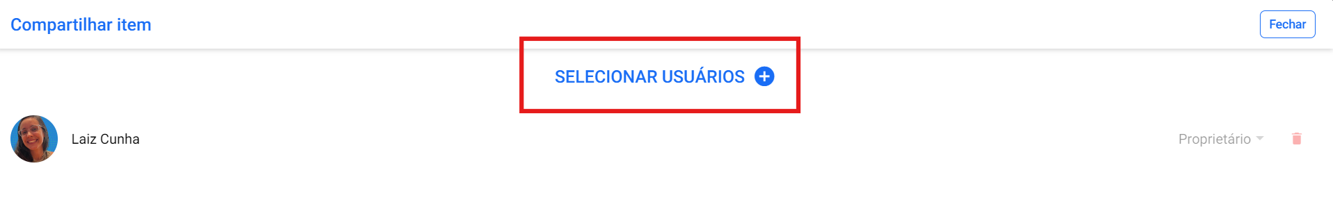 Ao clicar no botão 'Compartilhar', uma tela de seleção de usuários é exibida, permitindo que o profissional de saúde responsável pelo documento adicione outros usuários para visualizar e/ou editar o documento.