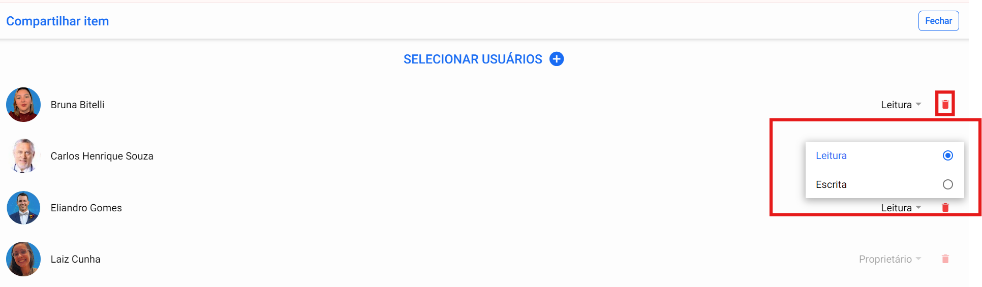 Ao clicar em 'OK', é possível ajustar o nível de permissão dos usuários para 'somente leitura' ou 'leitura e escrita', além de excluir um usuário do compartilhamento utilizando o ícone da lixeira. Apenas o proprietário do documento terá permissão para alterar as configurações de compartilhamento. Outros profissionais, mesmo que tenham acesso ao documento, não poderão modificar essas configurações.