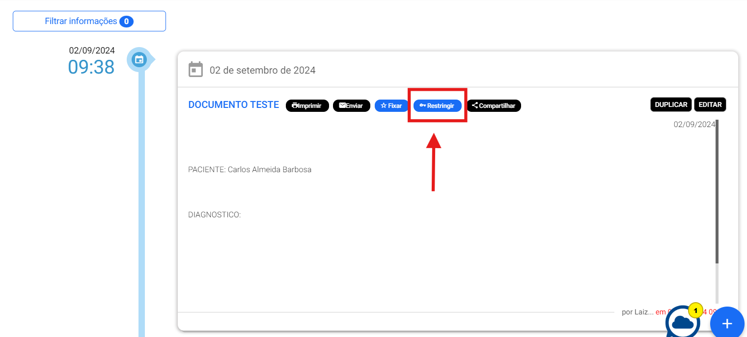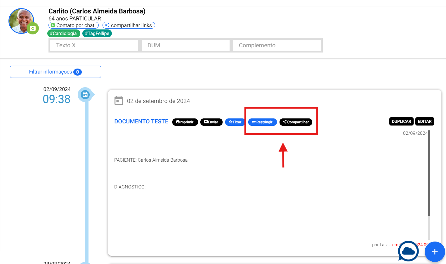 Ao salvar, o sistema redireciona para a página de prontuários. No documento criado pelo profissional de saúde, a nova funcionalidade disponibiliza os botões 'Restringir/Publicar' e 'Compartilhar'.