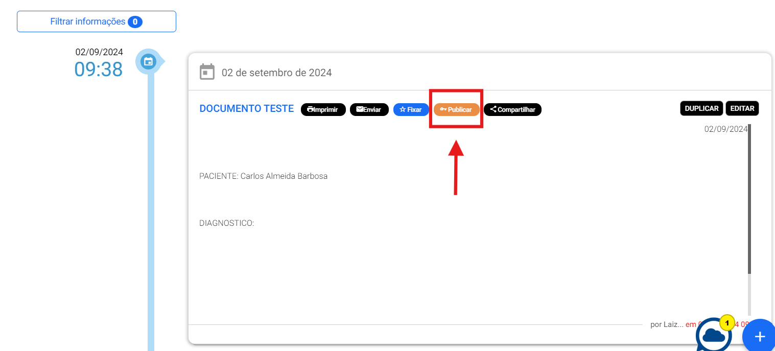 O botão 'Publicar' aparece quando há regras de compartilhamento adicionadas ao documento. Ao clicar em 'Publicar', todas as regras de compartilhamento são removidas, permitindo que o documento seja visualizado por todos os profissionais de saúde da instituição.