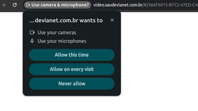 Quando entrar na sala o navegador ira solicitar permissão de acesso a câmera e microfone para serem usados na tela: