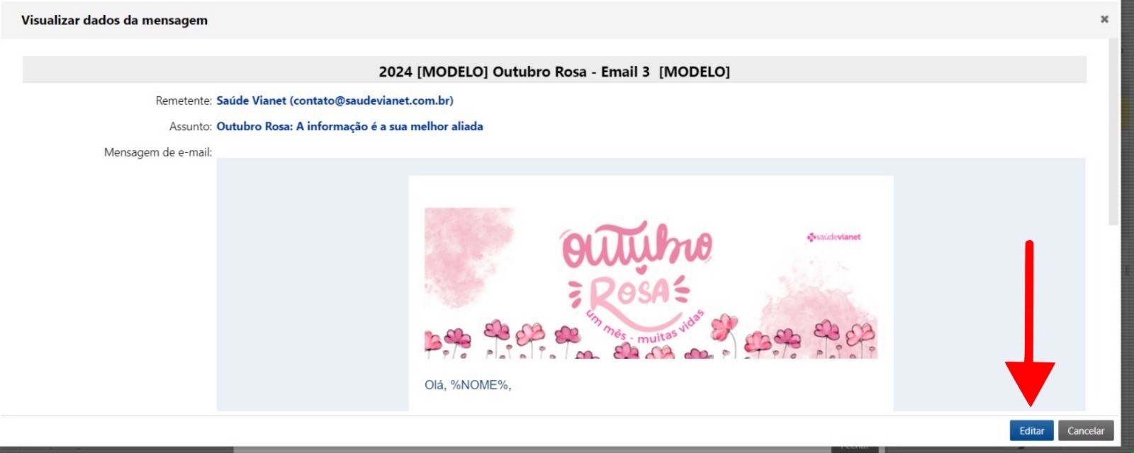 Se você quiser personalizar detalhes do modelo escolhido antes de ativar a campanha, clique na aba Mensagem e depois em Editar.