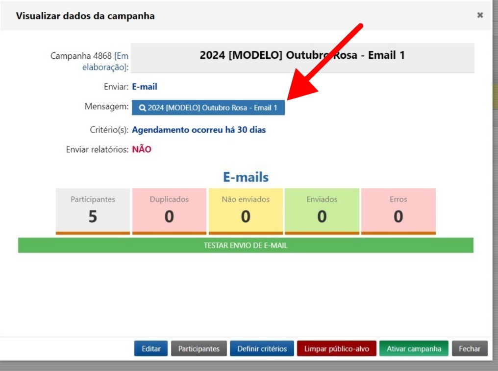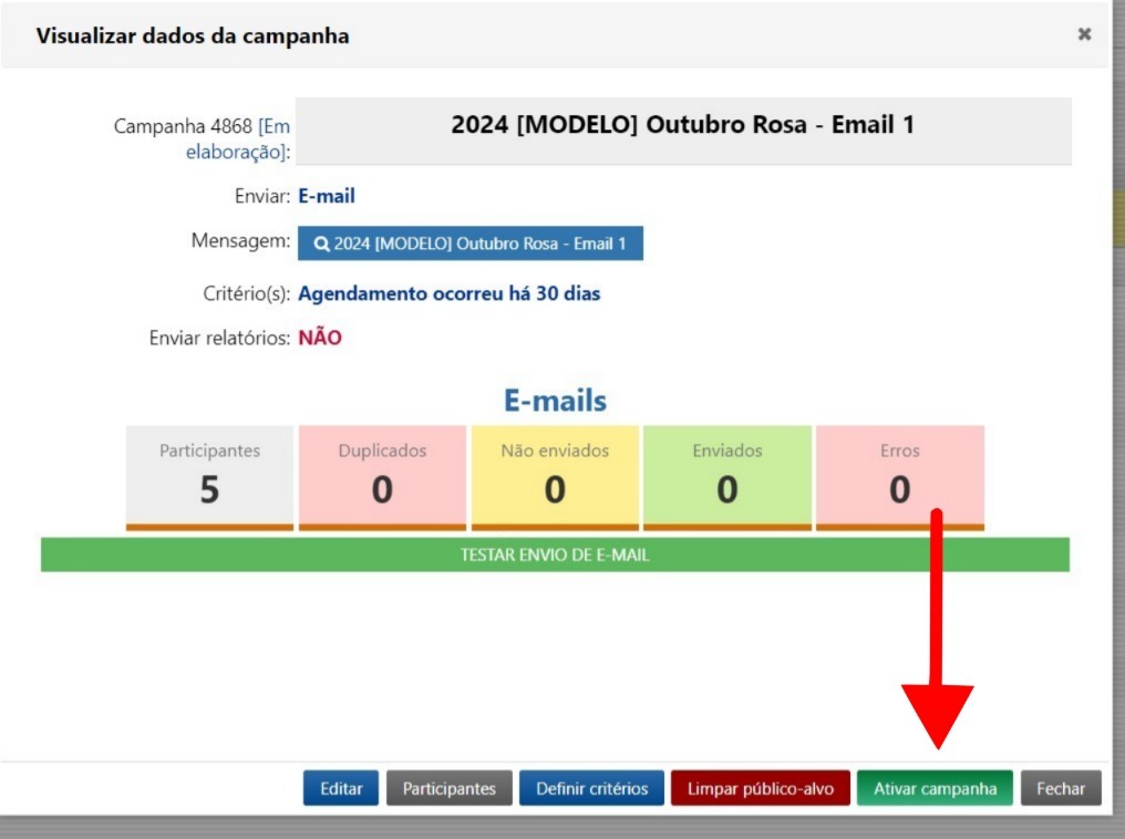 Após realizar o teste, a opção de Ativar campanha ficará disponível para iniciar o envio das mensagens.