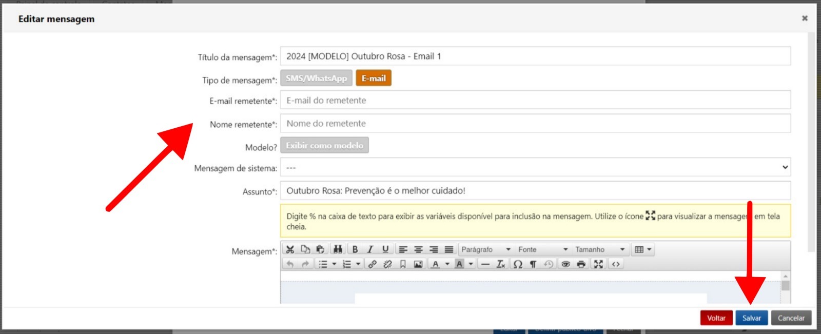 Nesta etapa, você poderá alterar o e-mail e nome do remetente, assim como o assunto e o corpo da mensagem. Após concluir as alterações, clique em Salvar para que sua mensagem seja enviada com as modificações.