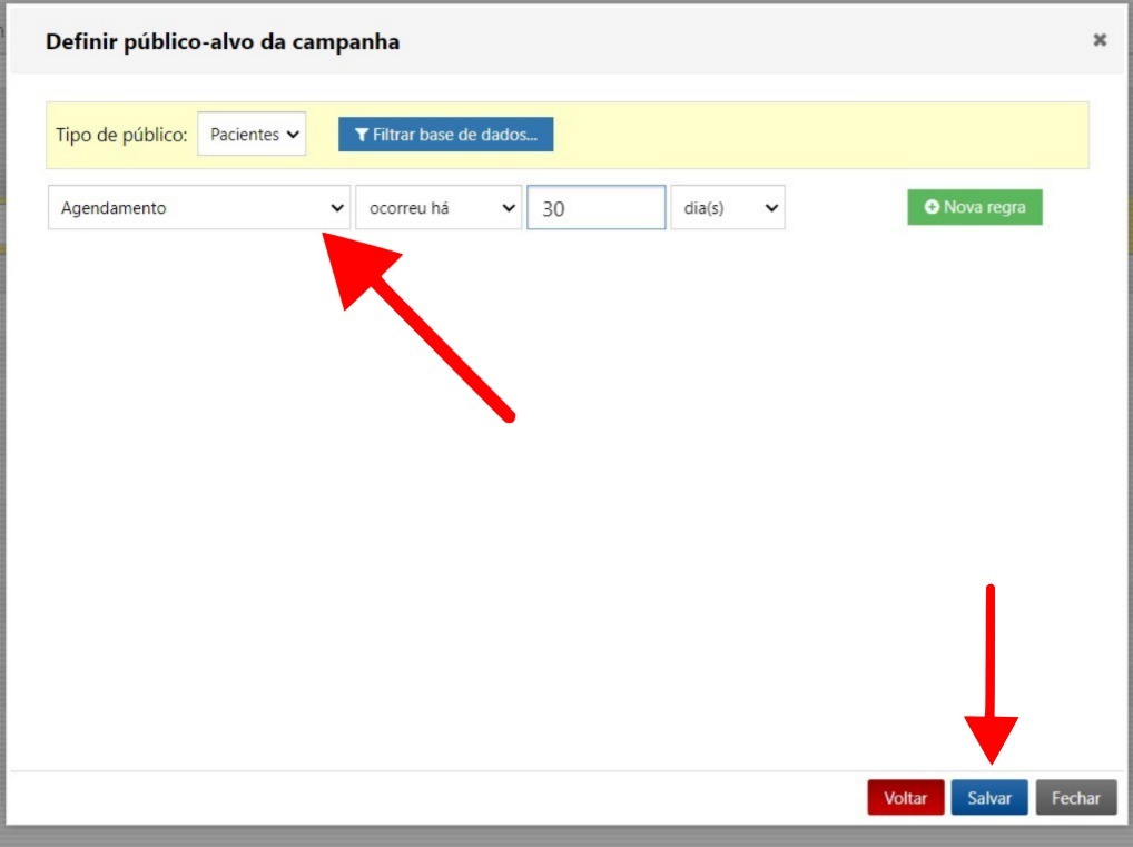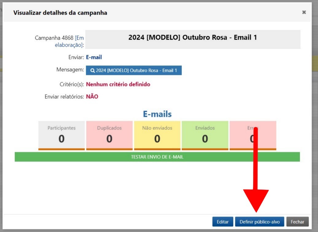 Em seguida, clique em Definir público-alvo para escolher os critérios de segmentação. Selecione as opções que definirão quem receberá a mensagem e, depois, clique em Salvar.