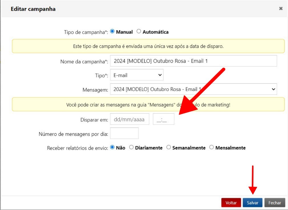 Na tela de edição, clique em Editar para definir a data e hora em que as mensagens serão enviadas. Após fazer os ajustes, clique em Salvar.