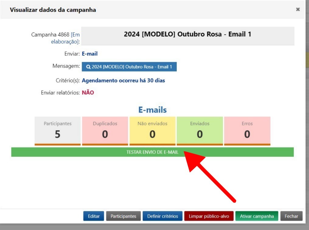Antes de ativar a campanha, recomendamos realizar um teste. Para isso, clique na barra verde de teste e insira seu e-mail (no caso de campanhas de e-mail) ou número de celular (para campanhas de SMS ou WhatsApp). Você receberá a mensagem no canal escolhido para revisá-la.